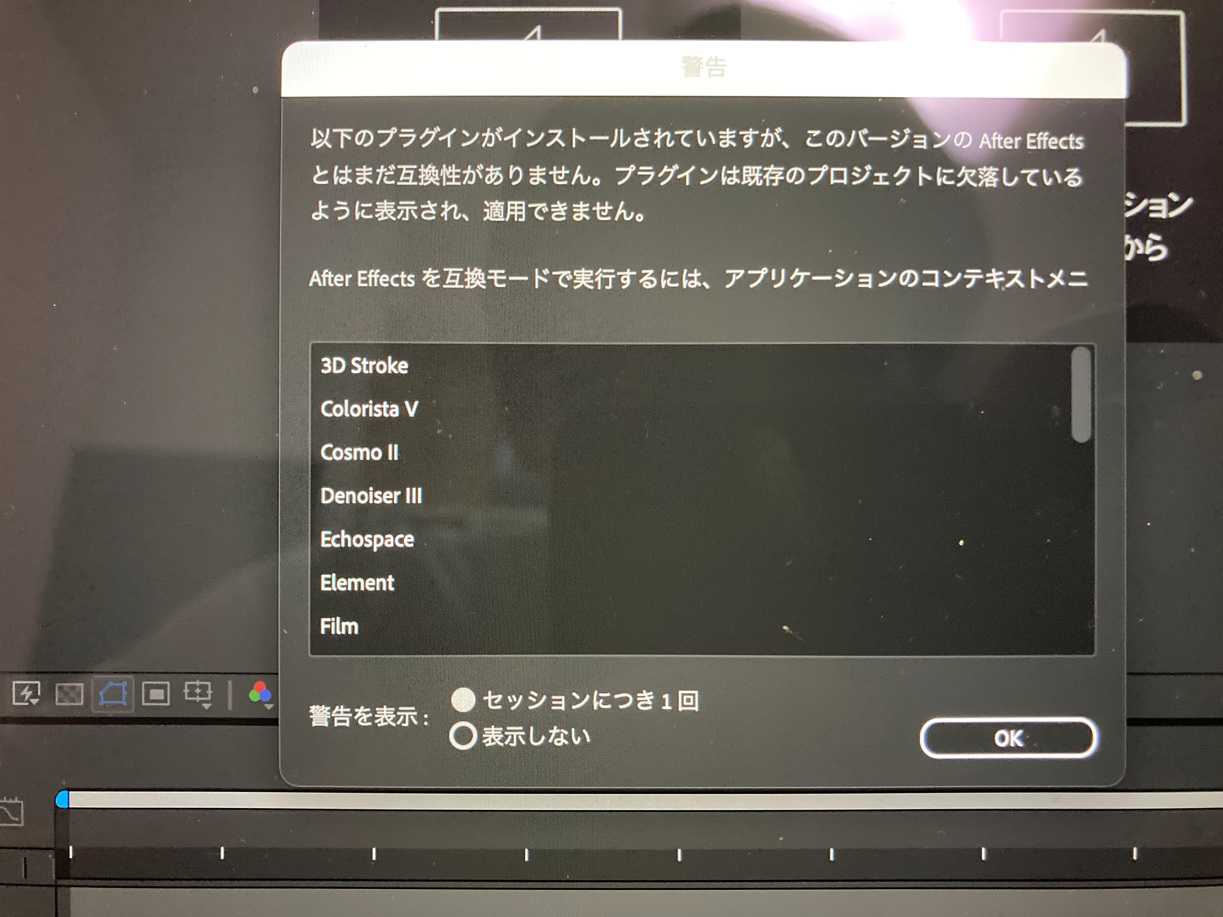 久しぶりにファイルを開いたところ、画像のようにプラグインの互換性がないって、警告が出てきて、依然ファイルで適用されてたプラグインが適用されてません、、