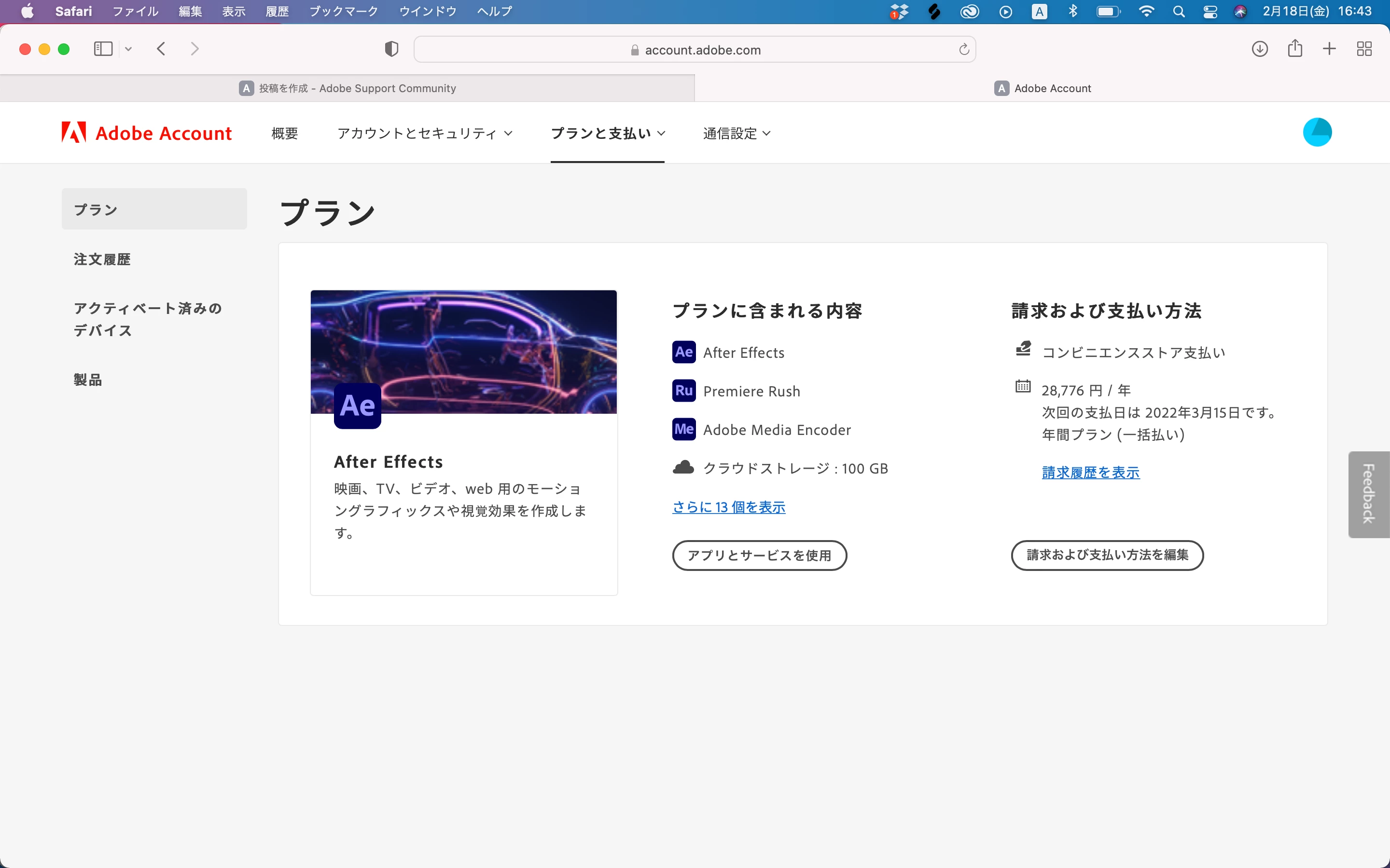 こんにちは。現在AEの一括払いのコンビニ振り込みといったプランで使っているのですが、つい先日振込申請の手紙が届き、これを機に月額のクレジット支払いのプランに変更しようと思いました。そこでAdobeのヘルプより、プラン変更の手順を踏んで進めてきたのですが、Adobeアカウントの画面でプランを選択し、変更しようと思ったのですが プラン管理 のボタンがありません。これは何故でしょうか、またこうなった時のプラン変更の仕方をわかる方いらっしゃいましたら教えてください。よろしくお願いします。