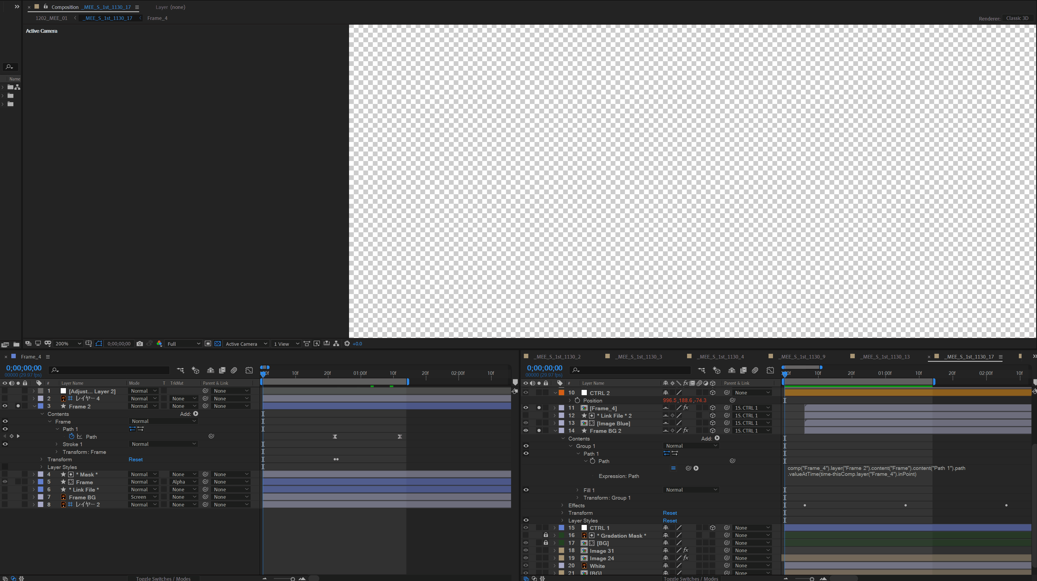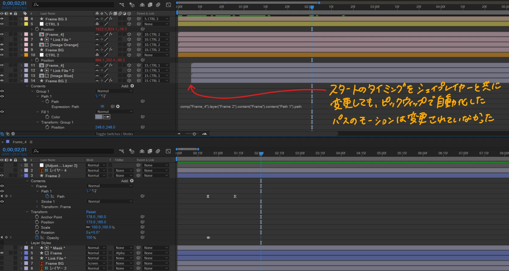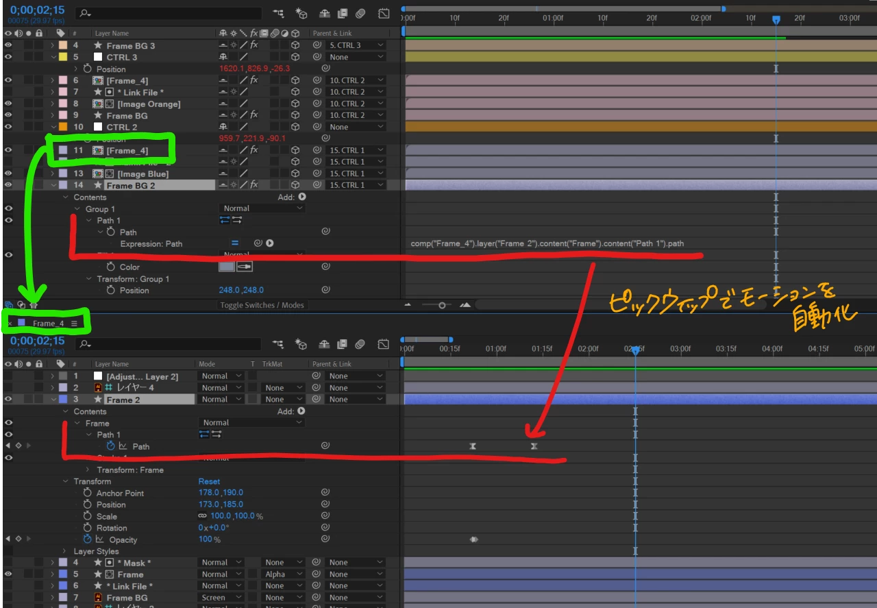 1つのシェイプレイヤーに対してパスのモーションを施し(添付画像の緑で囲んだレイヤー番号11【Frame_4】プリコンポジション内シェイプレイヤーFrame_2)、