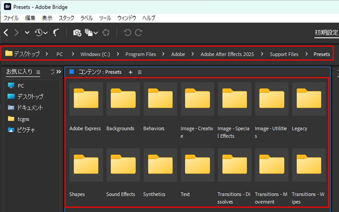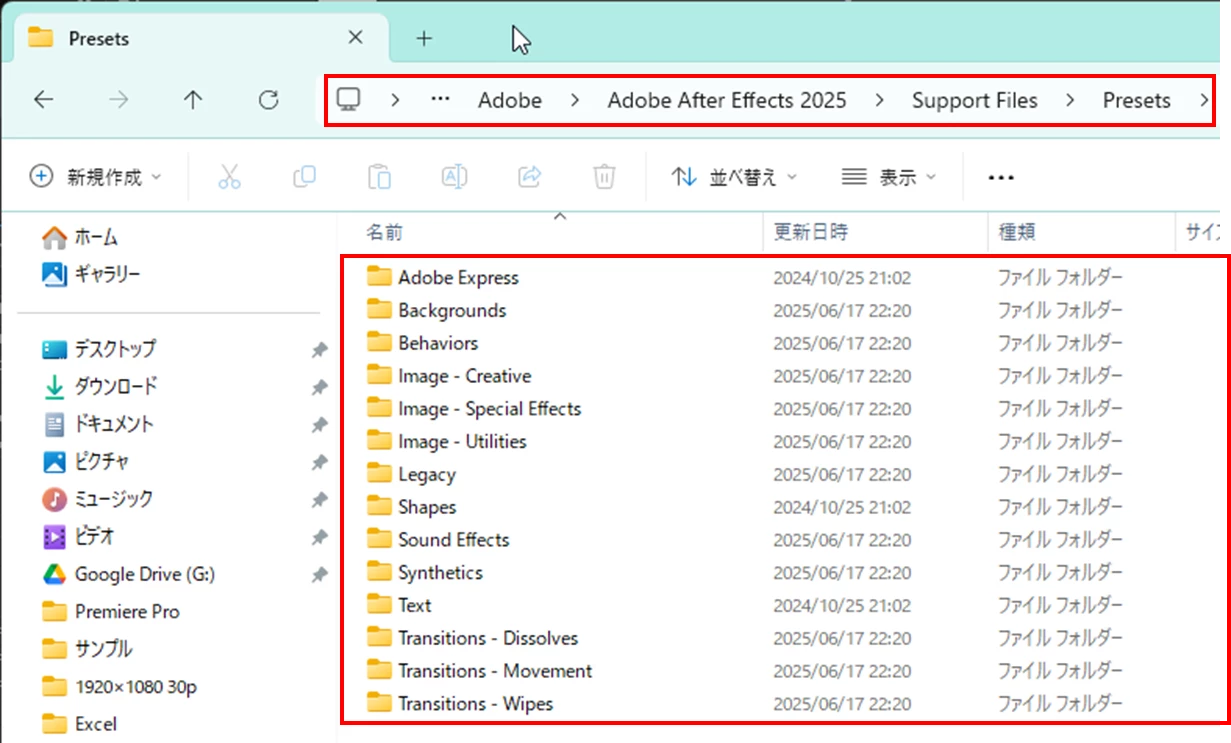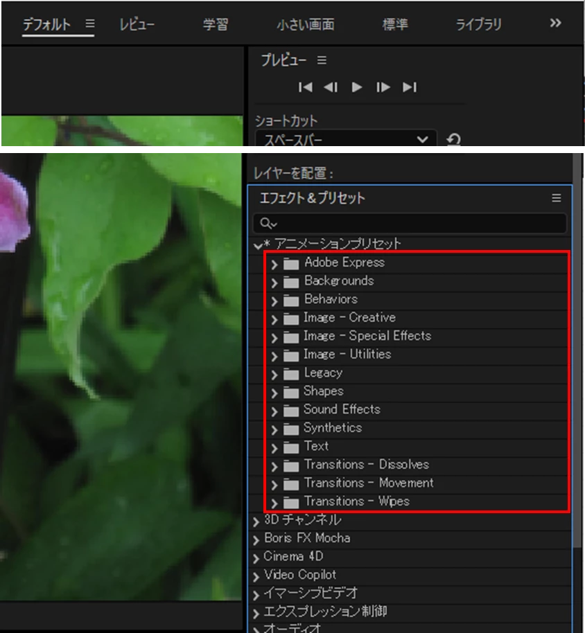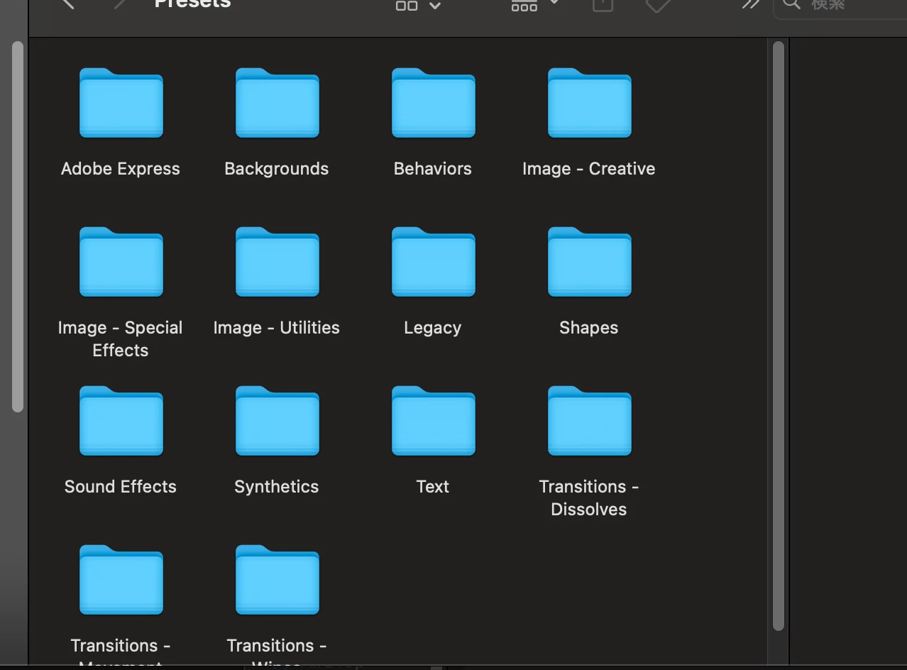 添付した画像のプリセッツファイルがAEの画面右側にあるEffects&Presetsの欄に出てきません。