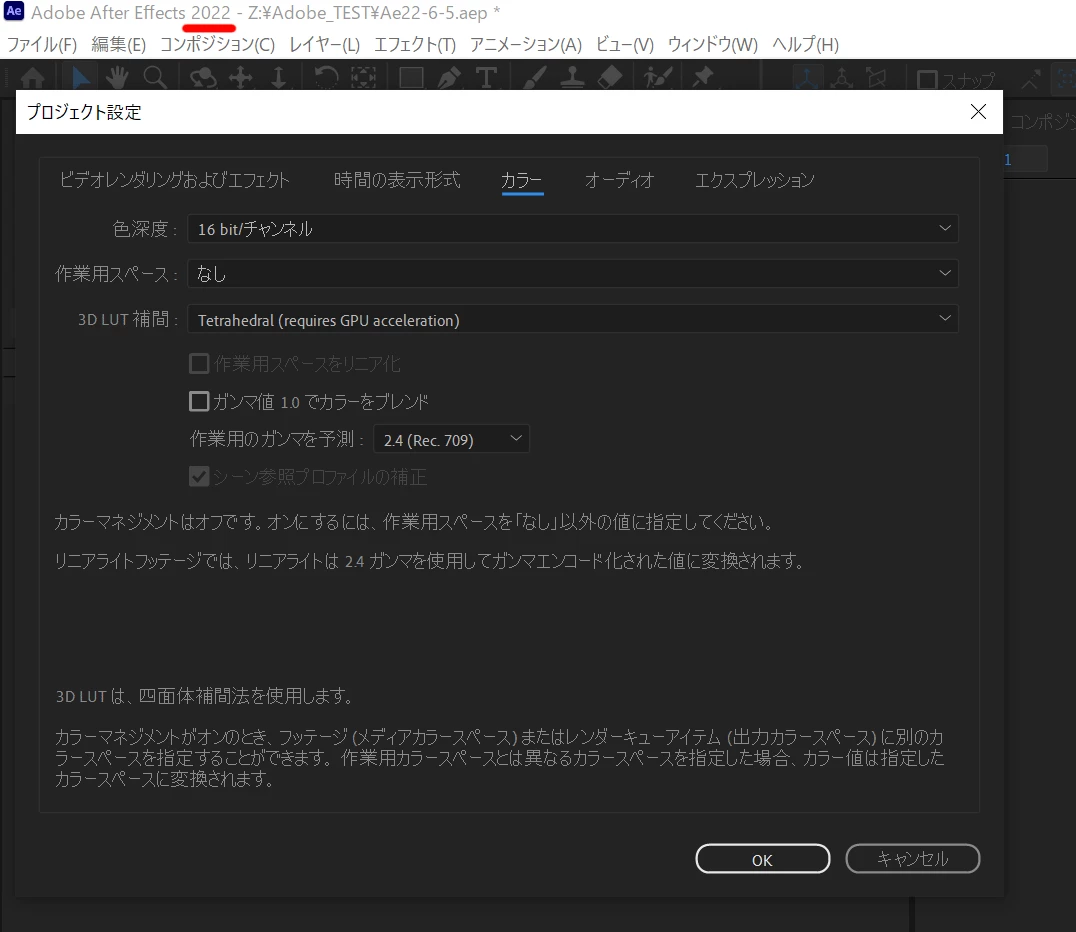 AE2022.6.5を同機種に複数台にインストールしたのですが、プロジェクト設定のカラーの項目に「カラーマネジメント」の項目が表示されているPCと表示されないPCがあります。