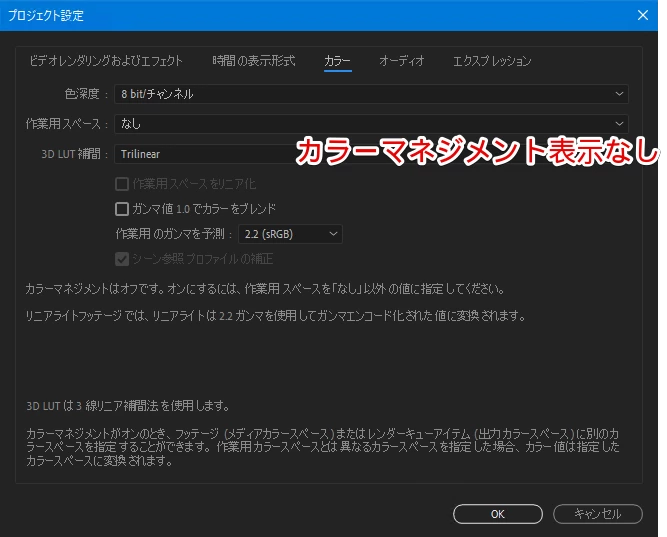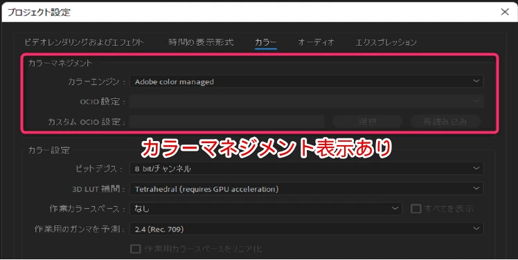 プロジェクト設定のカラーマネジメント設定が表示されない