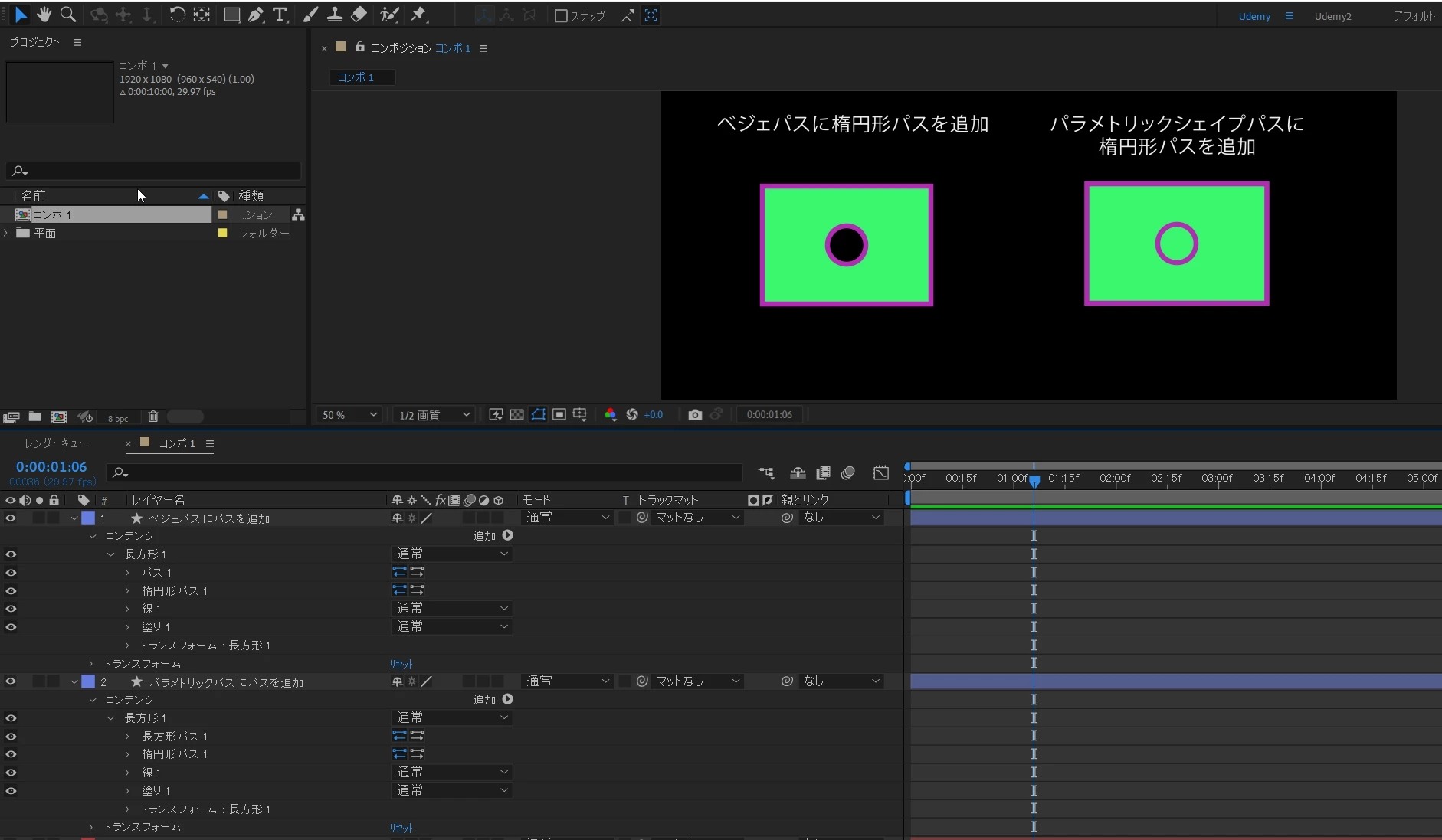 ② ①のシェイプレイヤーの[コンテンツ]→[追加]で楕円形パスを追加。