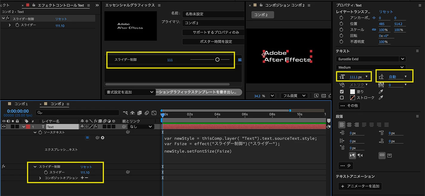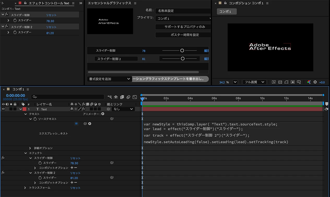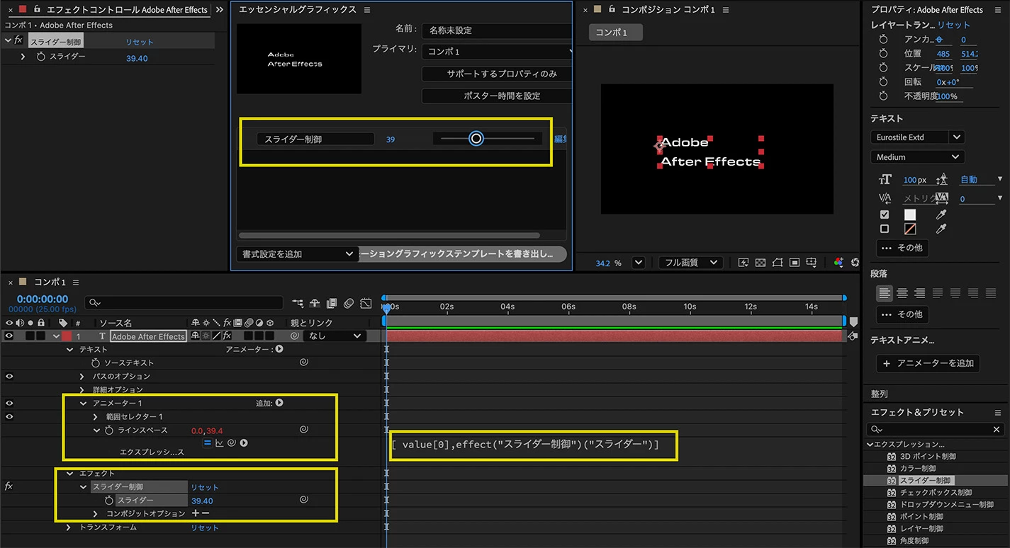 テキストレイヤーにアニメーター「ラインスペース」とエフェクト「スライダー制御」を追加します。