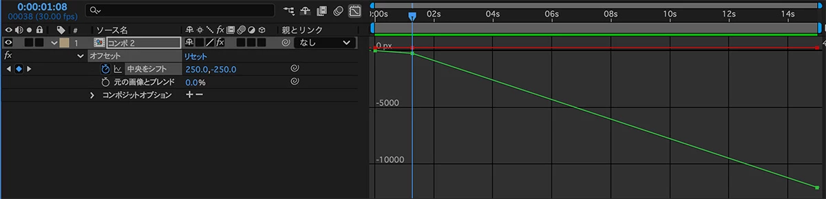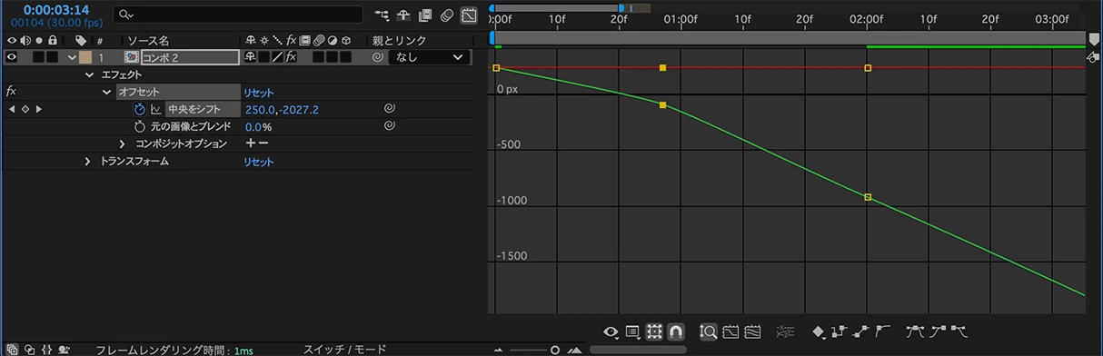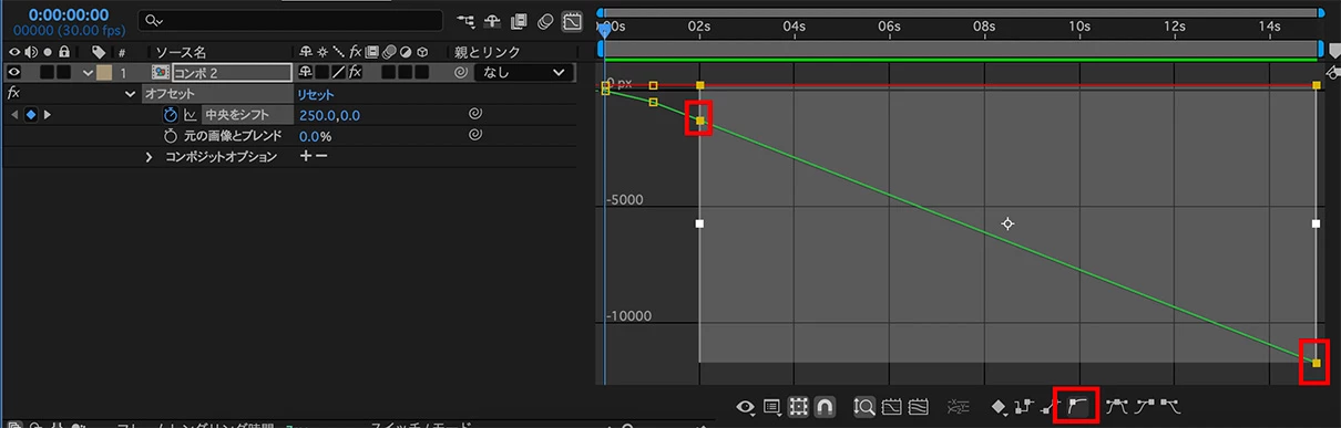 1秒目のキーを上方向に移動させたことで、1秒と2秒の間の直線部分の傾斜が強くなった為(速度が速くなる)、速度の調整を行います。
