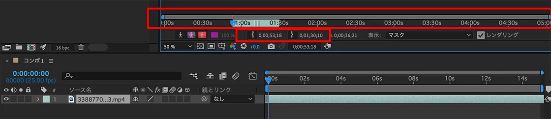 をコンポジションの長さではなく、その下のタイムコードのほうにして