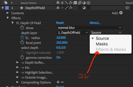 私はAfterEffects CC2017〜で追加されたのエフェクトのレイヤーセレクトプロパティの[Source,Masks,Effects&Masks]をスクリプトで変更する方法を探しています。