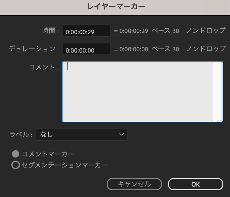 また、その設定ウィンドウは、対象のマーカーのダブルクリックによって開かれると記載されていましたが、 現状時間情報とコメント程度しか表示されません (下記スクリーンショット)。