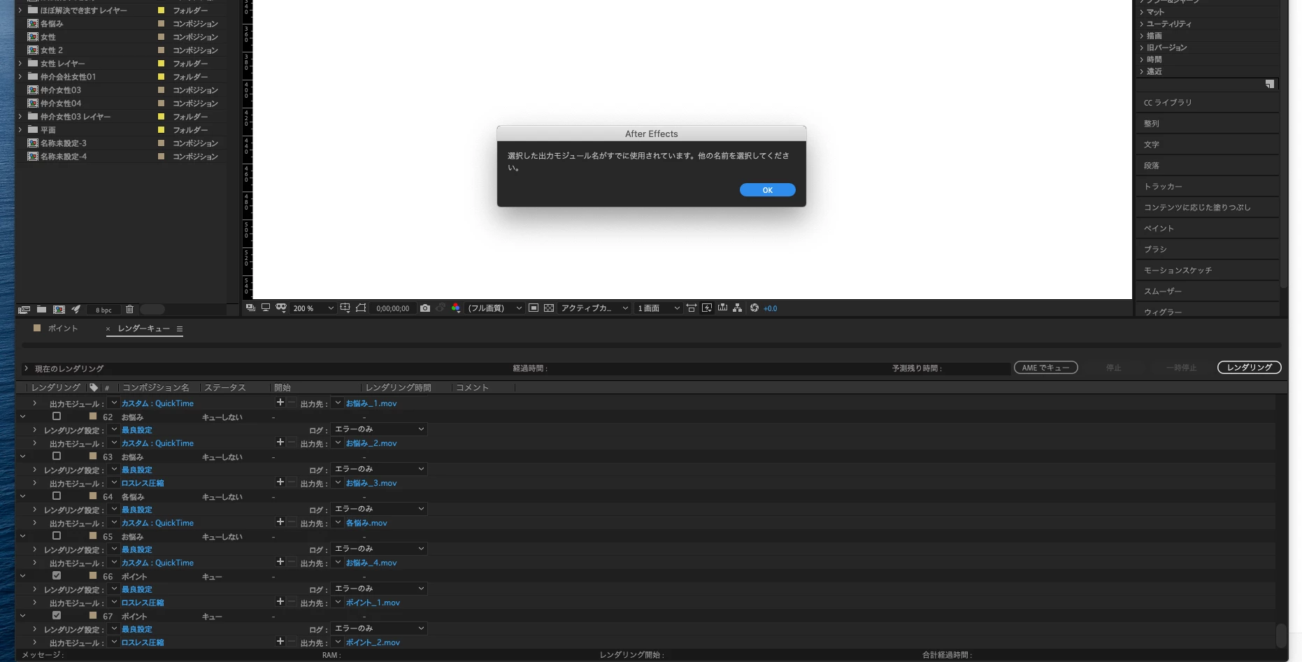 YYasuhiro YamakitaParticipantForum|Forum|5 years agoFebruary 20, 2021Questionレンダリング時の出力モジュール名のエラーについてForum|Forum|5 years agoFebruary 20, 20212 replies1998 viewsレンダーキューでの書き出し時に「レンダリング」ボタンを押したあとに「選択した出力モジュール名がすでに使用されています。他の名前を選択してください。」という注告がでるようになったのですが、対応の仕方が分りません。どなたか分かる方がいたら教えてください。エラーまたは問題読み込みと書き出し