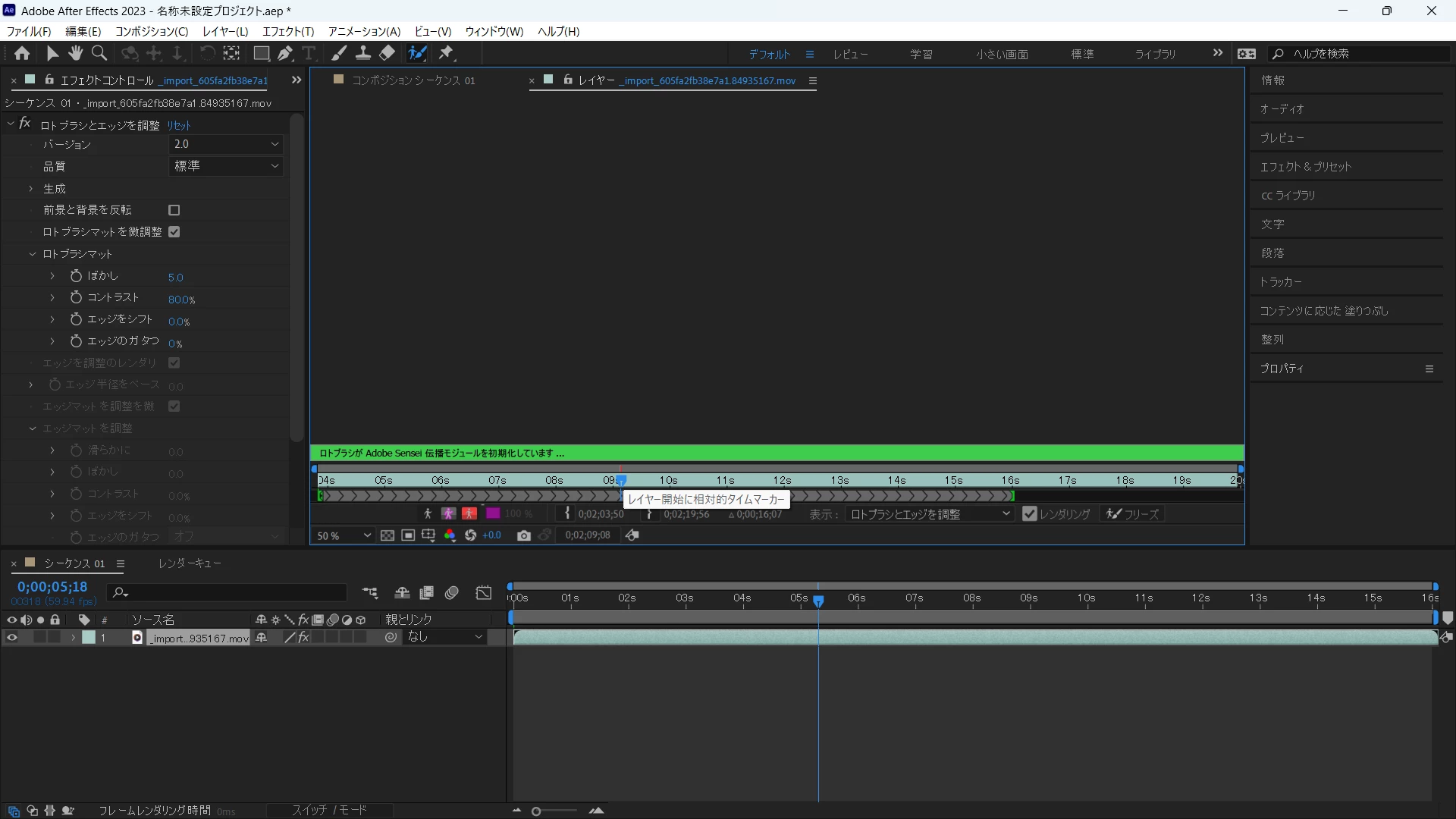 ロトブラシで被写体を選択後「ロトブラシが伝播モジュールを初期化しています」と表示されます