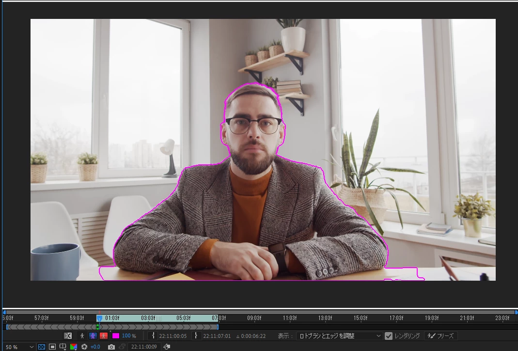 作業内容としてはフル画質表示でロトブラシツールとエッジ調整ツールで1フレーム毎に調整したのみで、他エフェクトなどはかけていません。