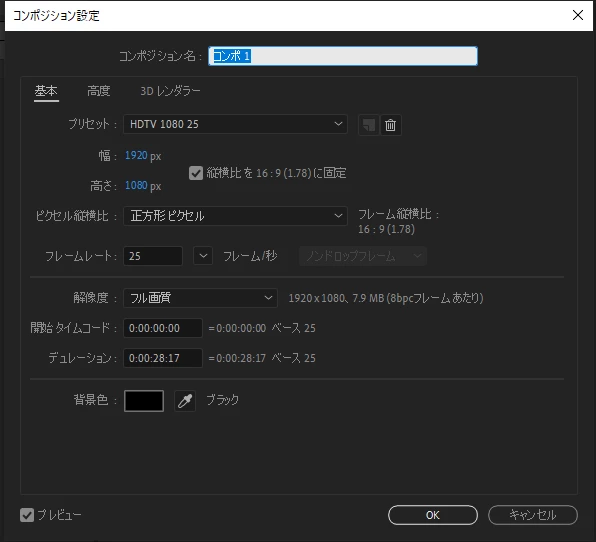3.チュートリアルでコンポジションのフレームレートと動画のフレームレートをあわせるような記載があったので改めてこのように設定しました。(画像3,4)