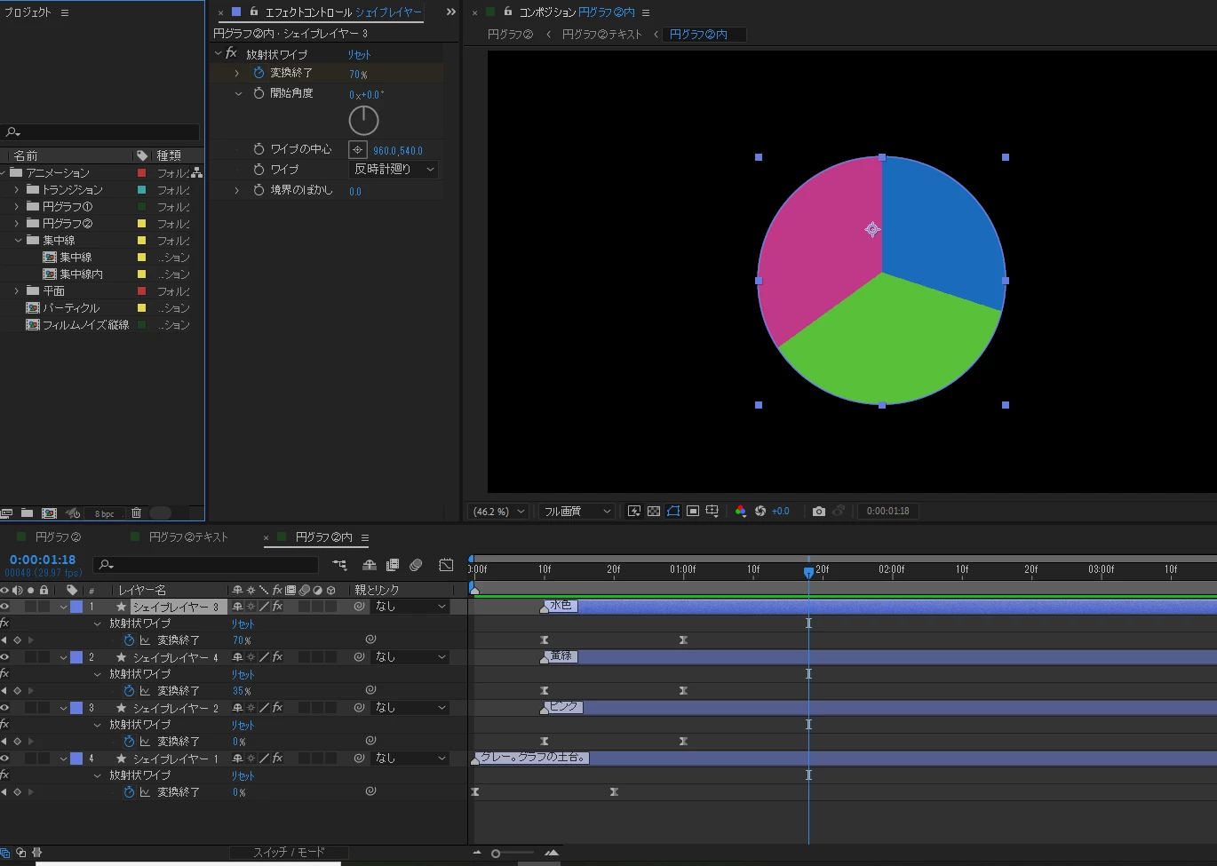 放射状ワイプの%の少ないレイヤーを上から順に並べ直すとすべての色が表示されるはずです。