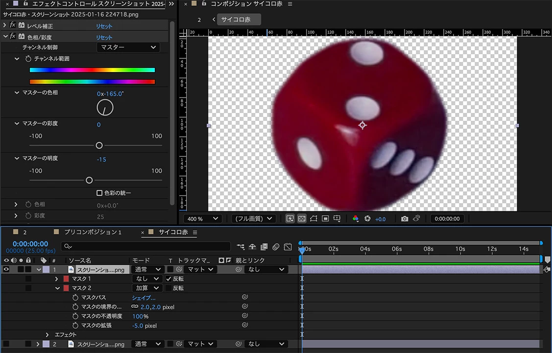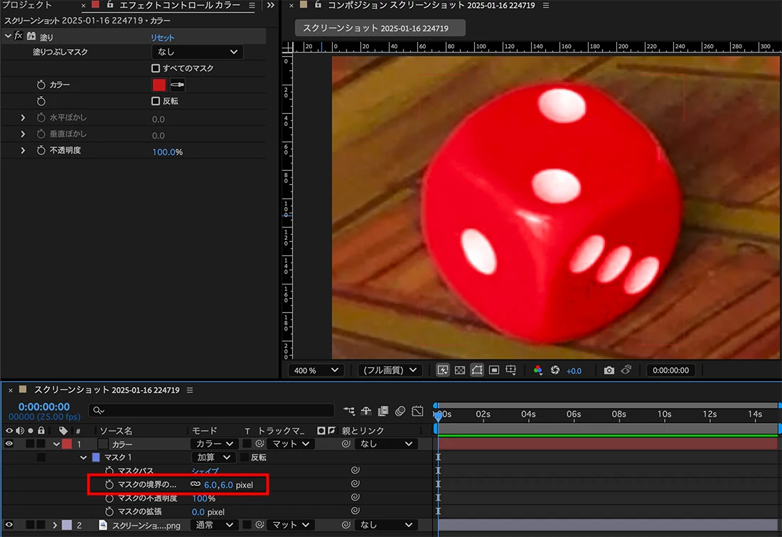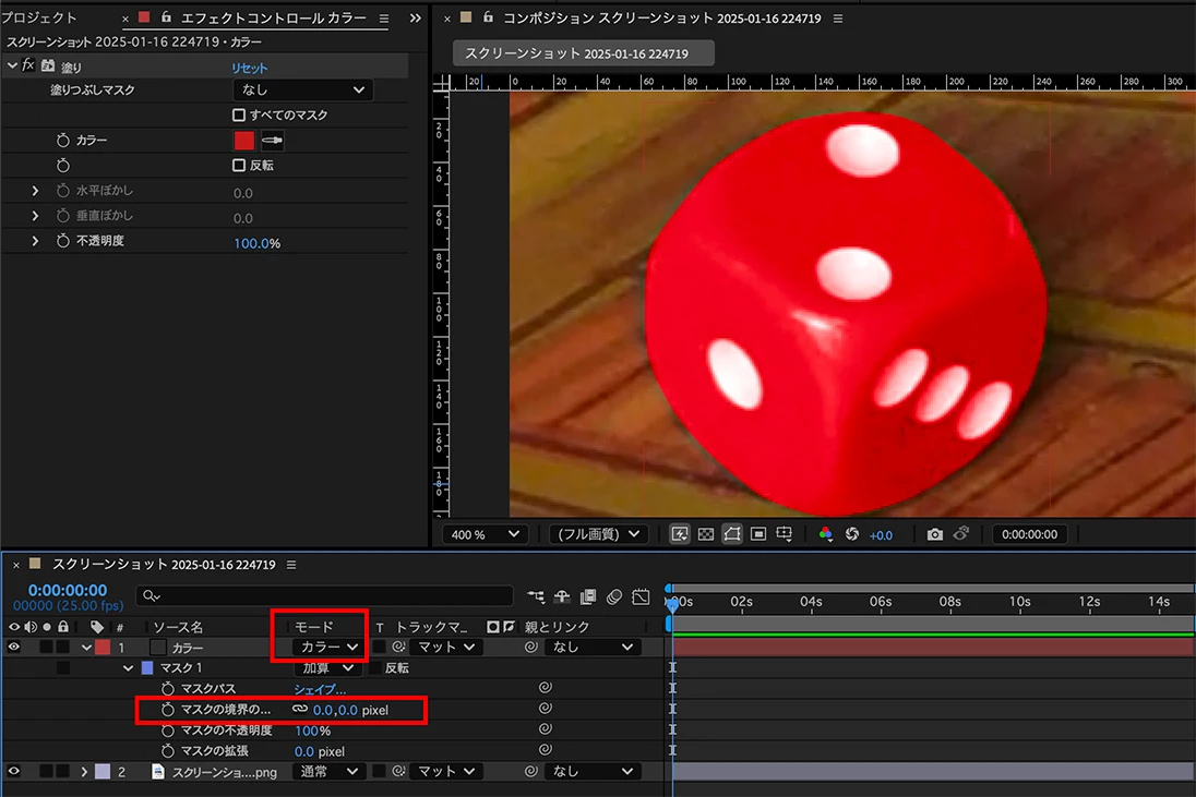 動画素材のレイヤーにマスクをかけて「他のカラーへ変更」のエフェクトをかけることで、動画の一部のみ色を変更したいのですが、対象物の縁が自然に色が変わってくれません。