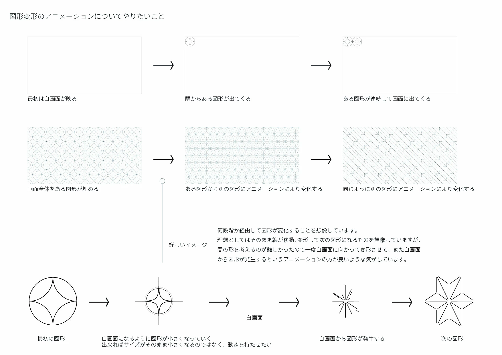 日本文化について動画的手法で広告のようなものを作るという大学の課題で、私は刺し子をテーマとして考えました。そして、刺し子のシンプルな図形で魅力的な画を作るためアニメーションが有効であると考えました。しかし、映像については特に経験が無く、premire proについても映像のカットと簡単なテロップ入れしか出来ません。そのためアニメーションを作成するために有効な方法が思いつかず、質問させていただいたという流れです。私が今回やりたいことは添付画像にまとめたので、そちらを参照していただきたいですが、簡単に言えば、刺し子のある柄から別の柄への変化を、アニメーションで表現したいというものです。