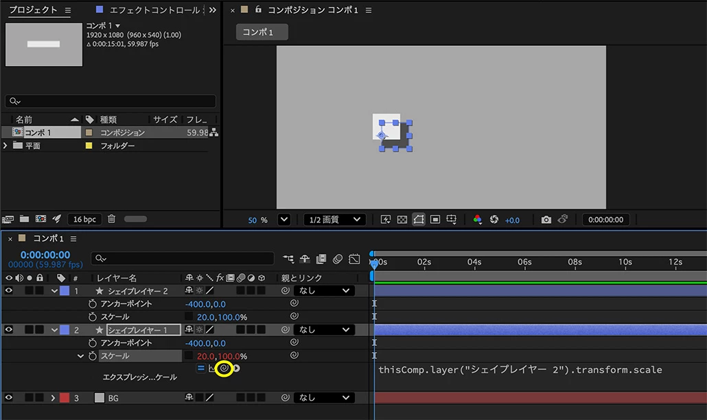 パスをエクスプレッションでリンクしているので、レイヤーを親子にしてしまうと挙動が変わってしまいます。