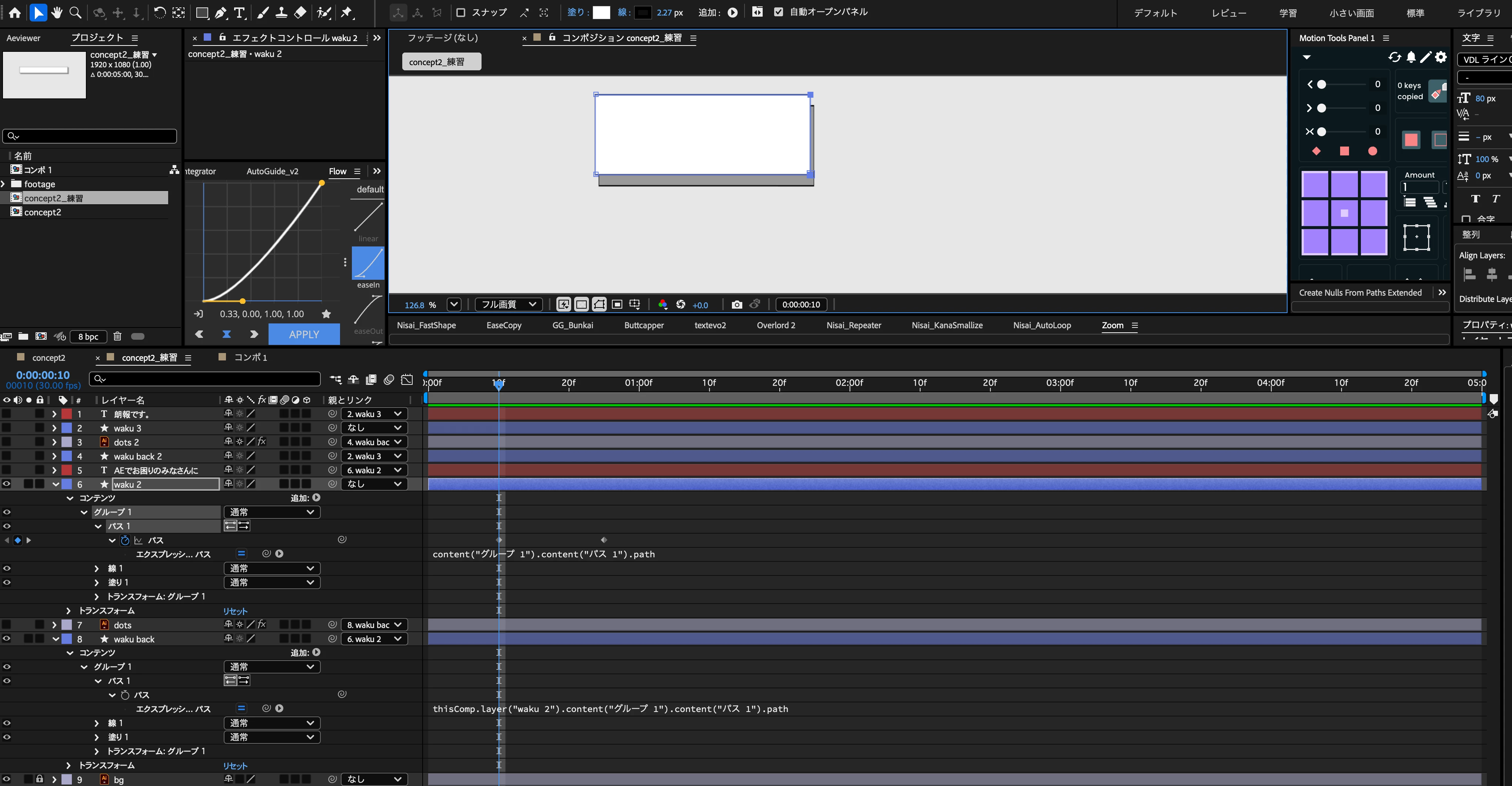 一番最初にwaku back (影枠)をwaku2(白枠)のパスに親子付けをし、エクスプレッションを作成→パスを変形させましたが、前に添付した画像のようになってしまいます。ちゃんとパスを動かしているのですが、うまくいきません。参考書を見ながらやっているのですが、参考書通りだとこのやり方でできると書いてありました。おっしゃっていただいたことも試し、他のやり方も試しましたがうまくできませんでした。なにが足りないのでしょうか。下記の画像で誤っている又は不足していることがあればご教授お願いします。