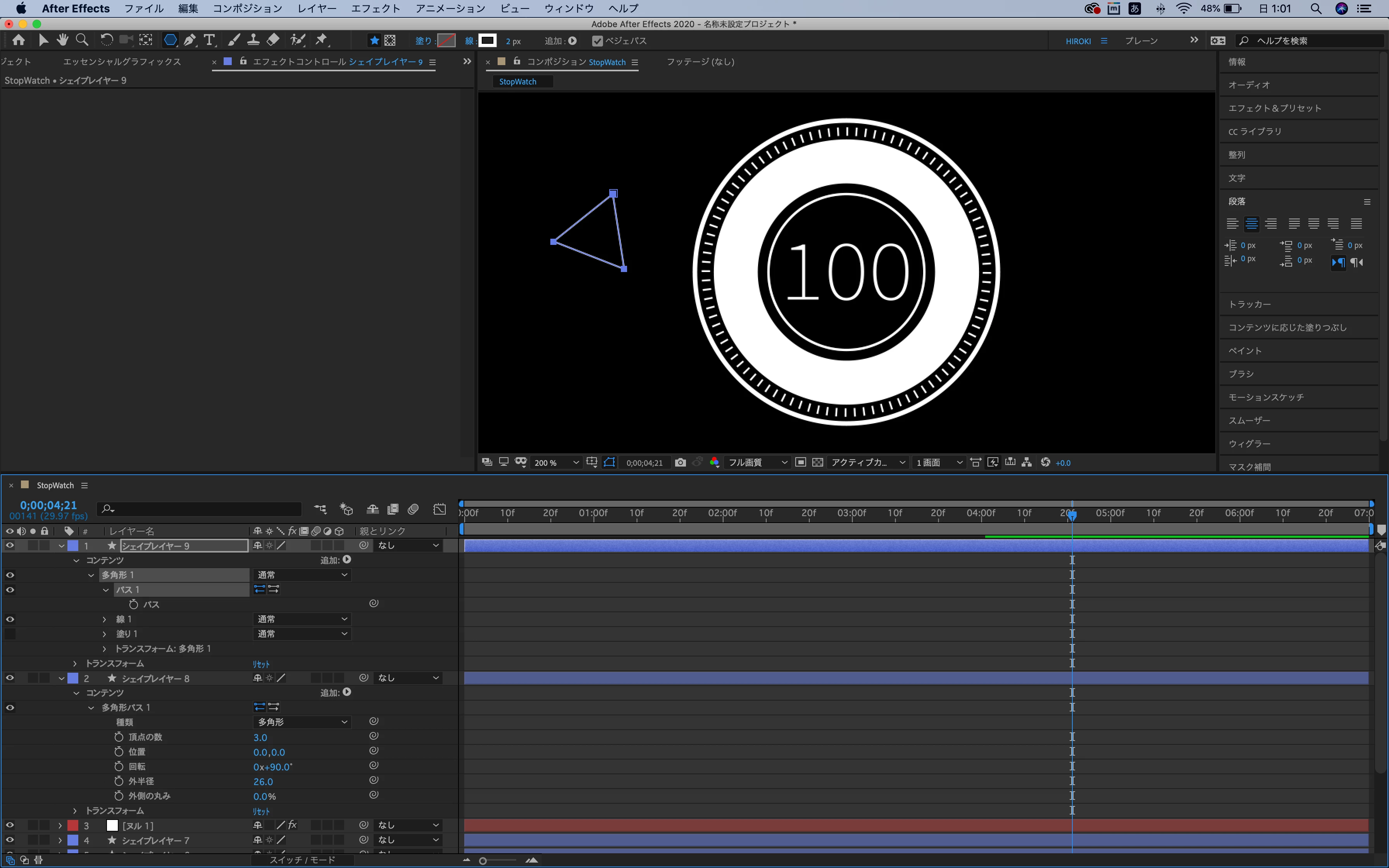 本来「多角形パス1」と表示されるべき部分が「多角形1」と表示されてしまい、頂点の数などのプロパティが表示されません。(シェイプレイヤー9)