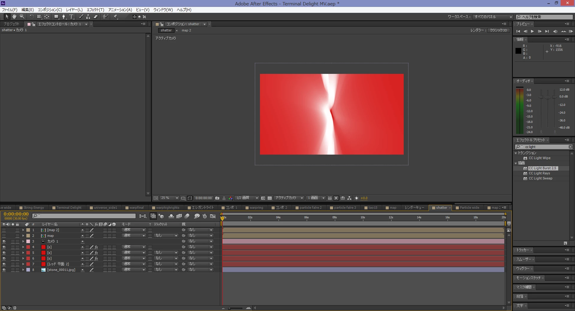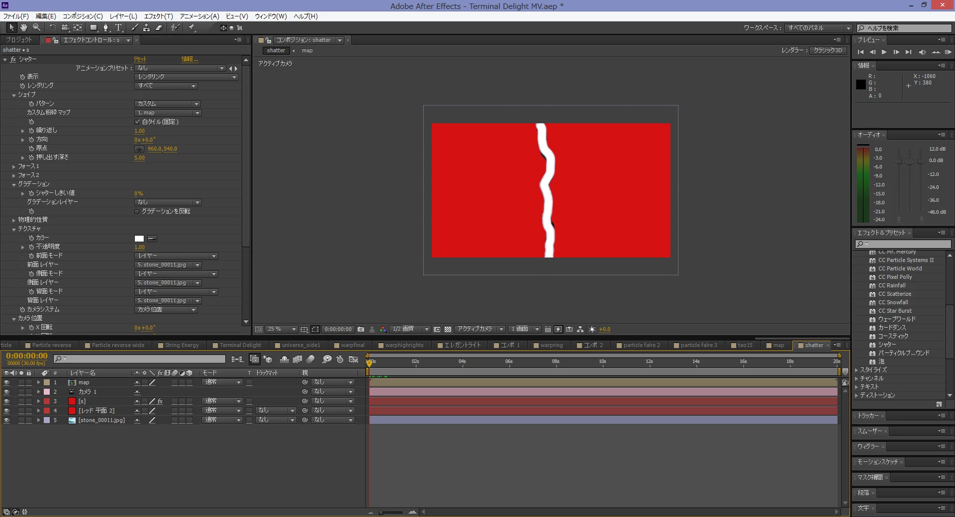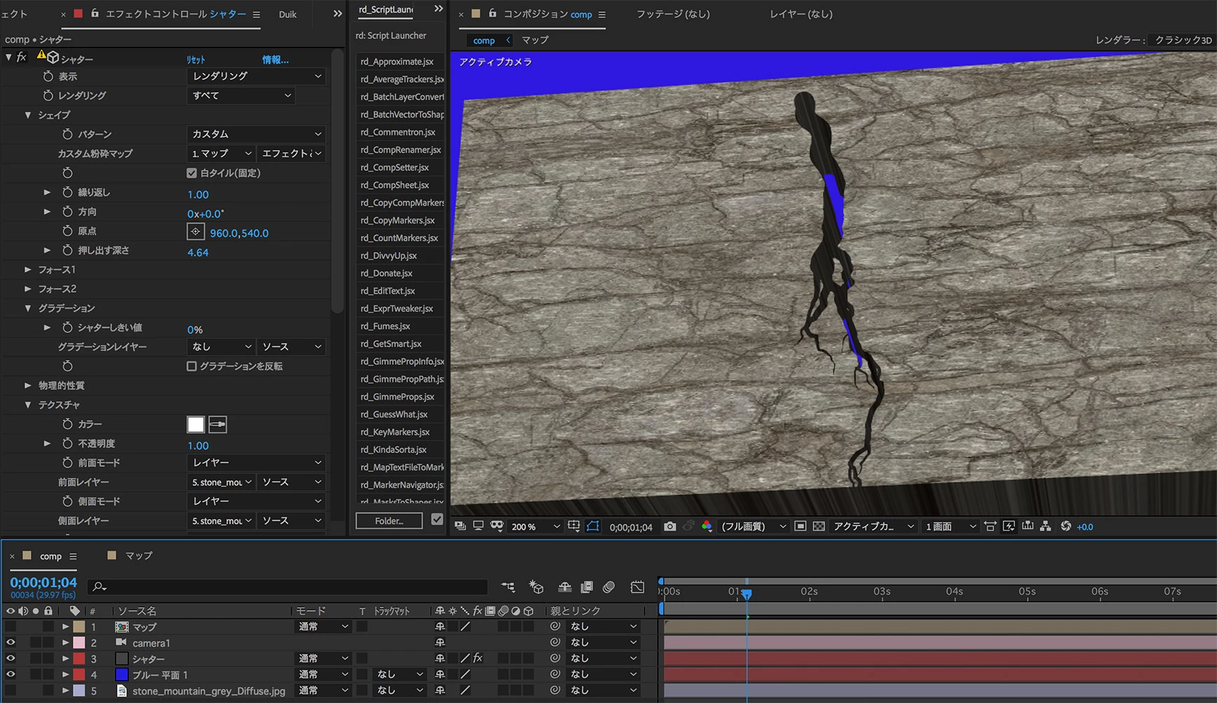3Dに見えるのは、シャターのカメラ位置の設定をコンポジションカメラに設定して、カメラ位置を変えているためです。