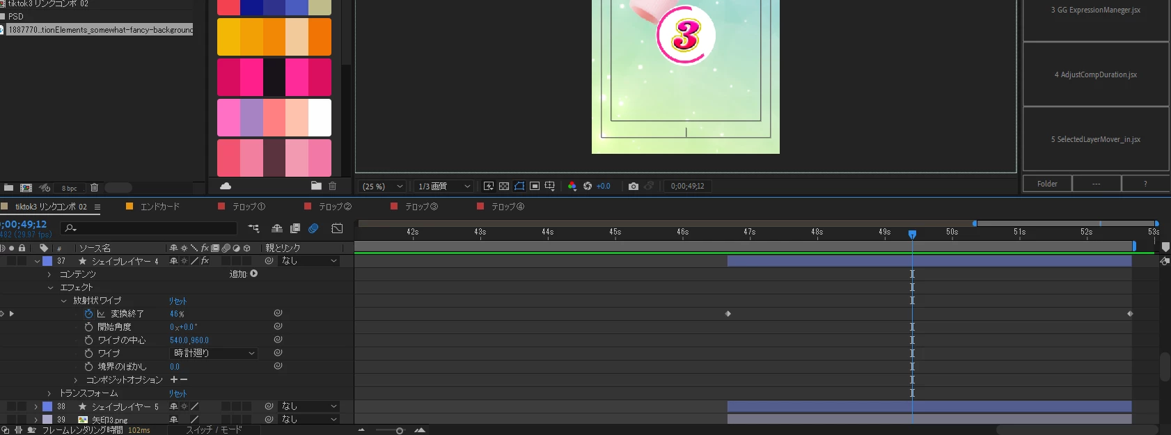 Kkjr666Known ParticipantForum|Forum|4 years agoMarch 2, 2022Answered放射状ワイプの動き方がおかしいForum|Forum|4 years agoMarch 2, 20221 reply1871 views5秒のカウントダウンアニメーションを作成しています。画像のようにカウントダウンが進むにつれてピンクの線が消えていくという演出をしようとしているのですが、シェイプレイヤーの長さに合わせて変換終了の値を100%から0%に設定したのですが、途中までは動かす、いきなり両サイドから消えていくというおかしな動きになります。これは何故でしょうか?FAQ