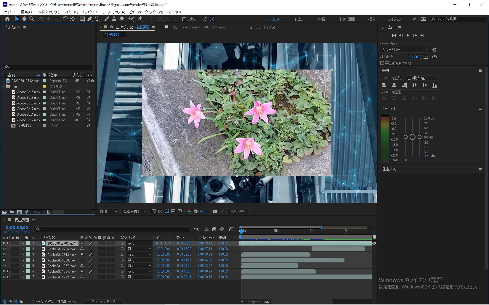 但し、コンポジション設定でデュレーションを必要な長さに設定しないと、途中で動画が切れてしまいます。