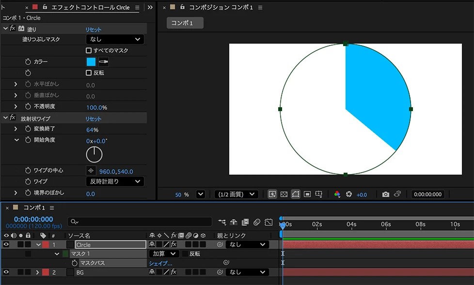 円形の作成して、「放射状ワイプ」を使用すれば作成できます。