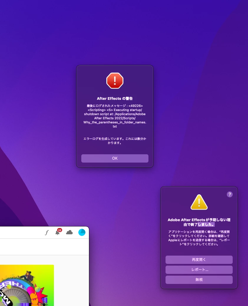 このような警告文が出てきて一切開かなくなりました。Ai、Psは通常通り開くのですがAE2022、AE2021両方試しても同じような警告文が出てきて開けません。どなたか助けてください