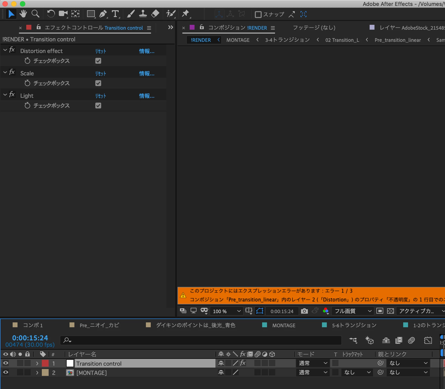 その中に「Transition control」というレイヤーがあり、そのレイヤーに「Distortion effect」が設定されていました。
