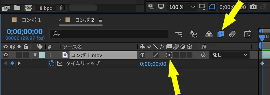 After Effectsでフレーム補間する際は、「タイムリマップ」と「フレームブレンド」の設定を行います。