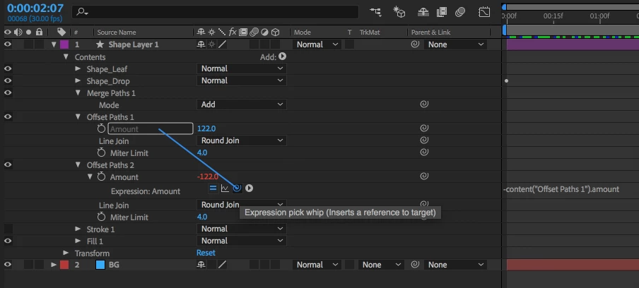 2の「量」のエクスプレッションフィールドを開いて、ピックウィップで1の「量」を引っ張り、