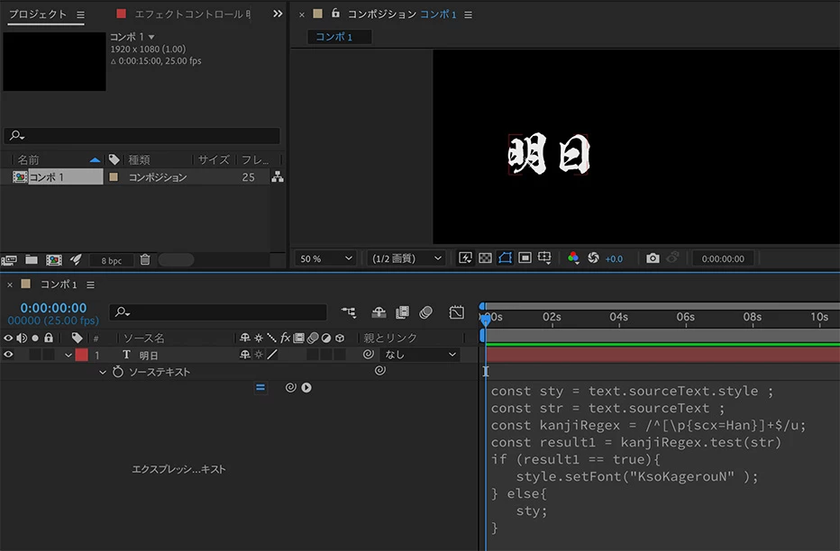 AEでソーステキストにエクスプレッションを適用して漢字カタカナひらがなが混ざったテキストでカタカナとひらがなだけ指定したフォントにすることは可能でしょうか?