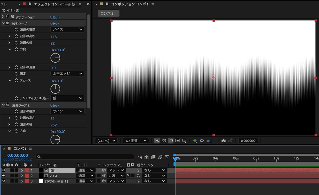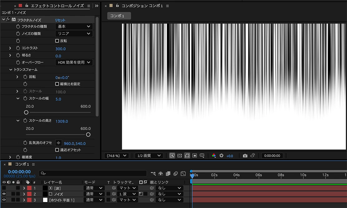 フラクタルノイズを縦に細長く伸ばせば線状になります。