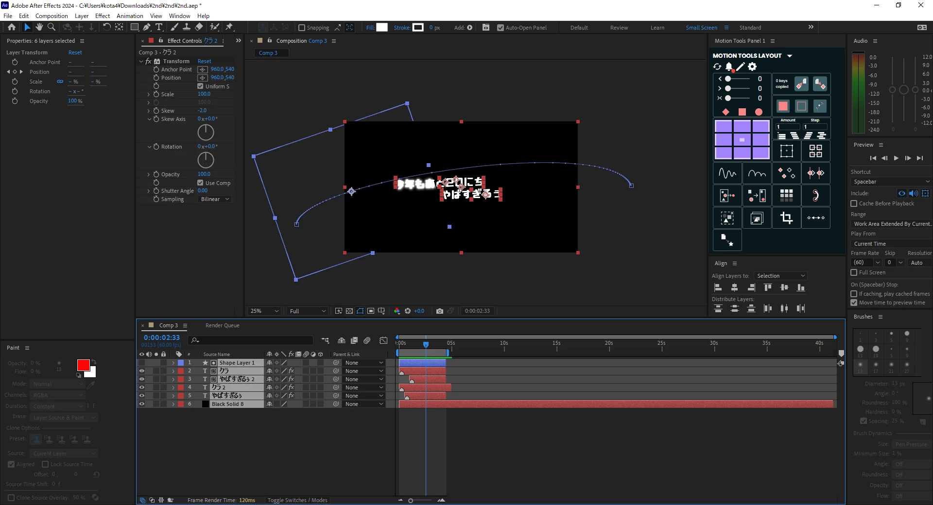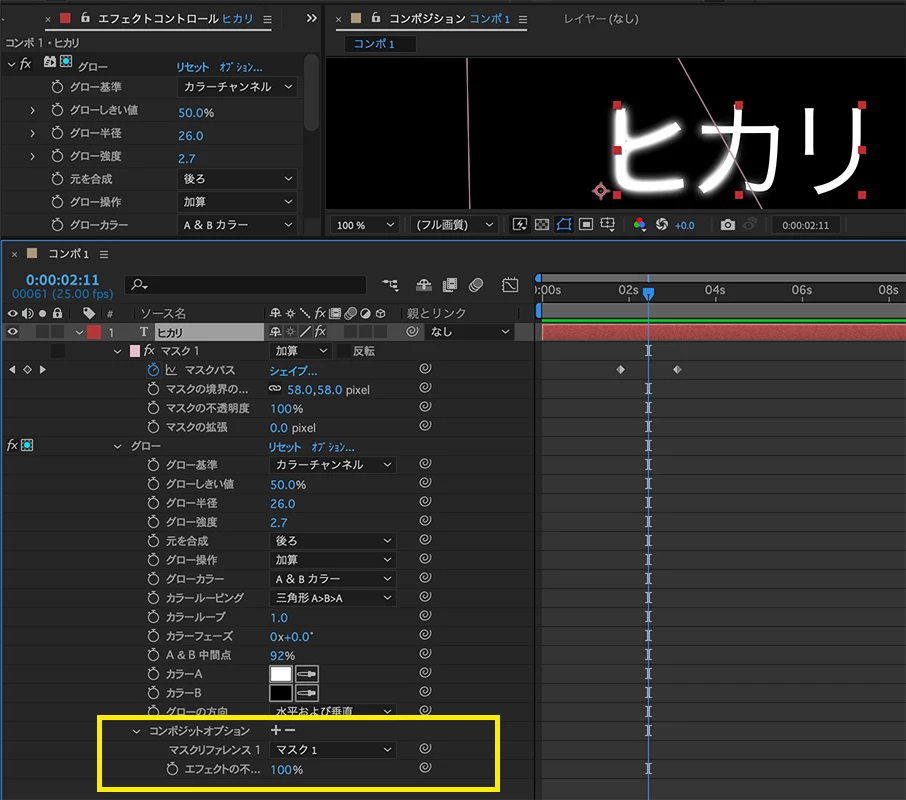 そこで光っている文字とそうでない文字、シェイプを用意してトラックマットで光らせる方法を考えてみましたが光る時に直線が気になってしまい納得できませんでした。