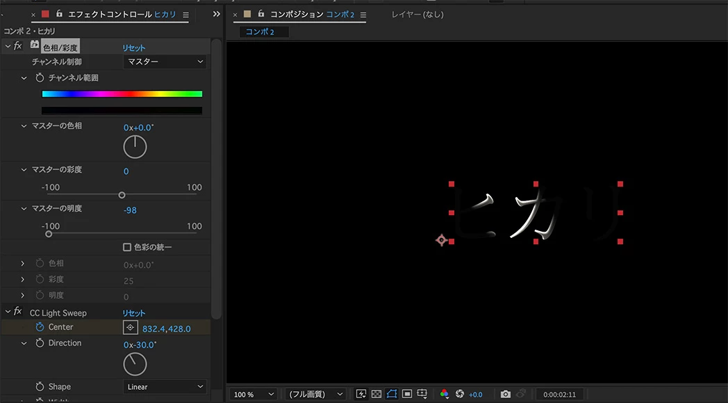 一つ目の動画の様な演出を作りたくチュートリアルなど調べていた所cc light sweep で作っているのを見て実際にやってみた所、白文字白い光なのが原因なのか上手くいきませんでした。