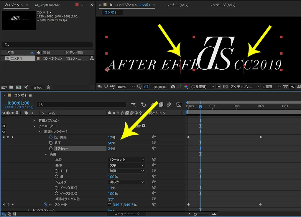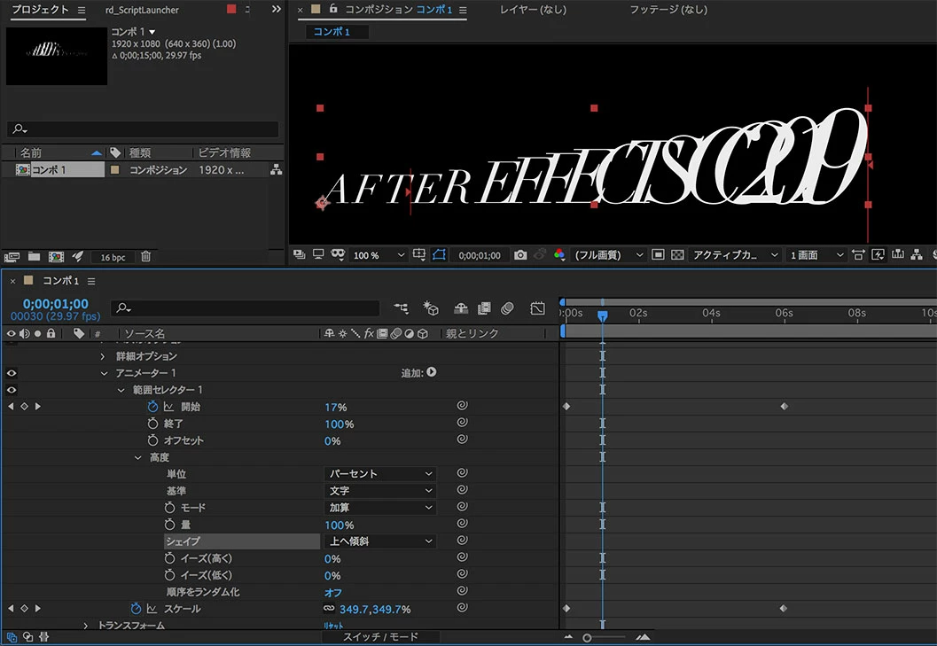 テキストのアニメーションの作り方は、標準のアニメーションプリセットに多数 収録されているので、プロパティを変化させて動きを確認すればチュートリアルがわりになると思います。
