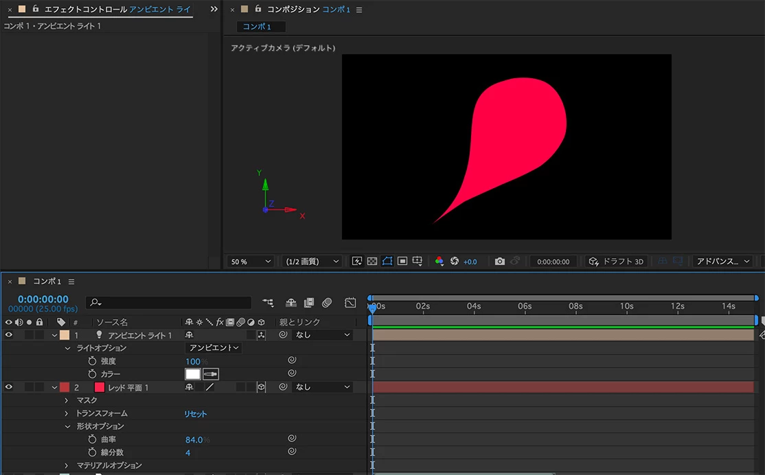 3Dレイヤーにして、レンダラーをアドバンスに変更します。