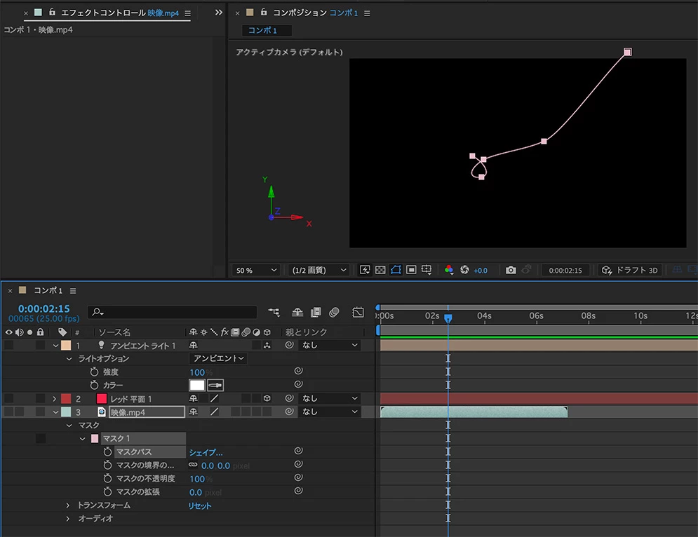 動きは、マスクでもシェイプでも構わないので、ペンツールで動く軌道を描いてパスをコピーします。