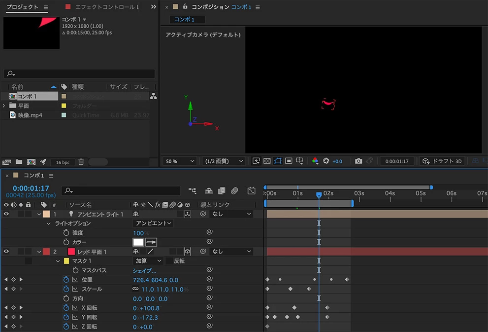 花びらレイヤーの「位置」にキーフレームを追加してからパスを貼り付けると、モーションパスが作成されます。