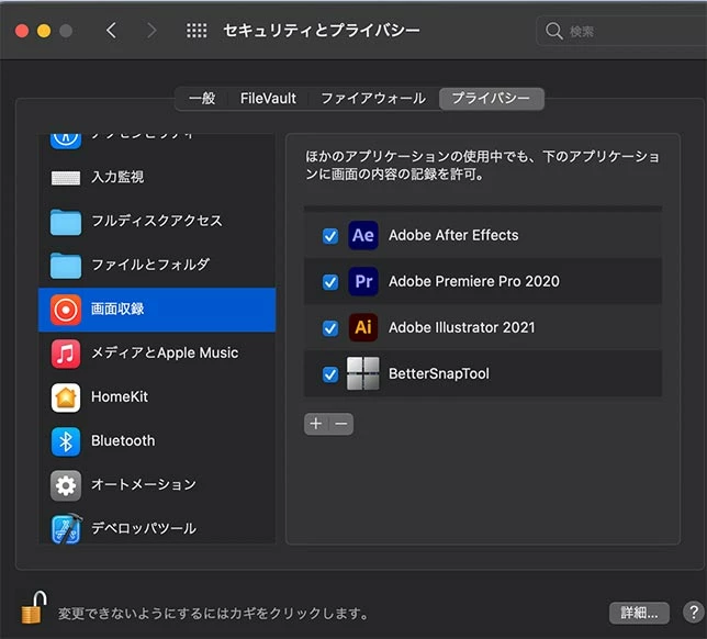 アクセシビリティ/フルディスクアクセス/ファイルとフォルダー/画面収録