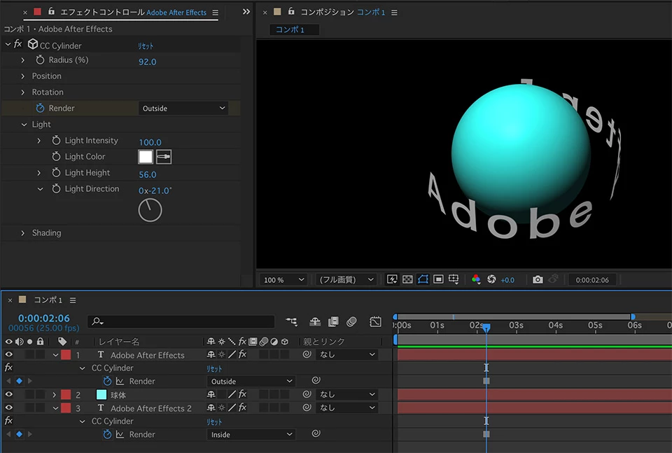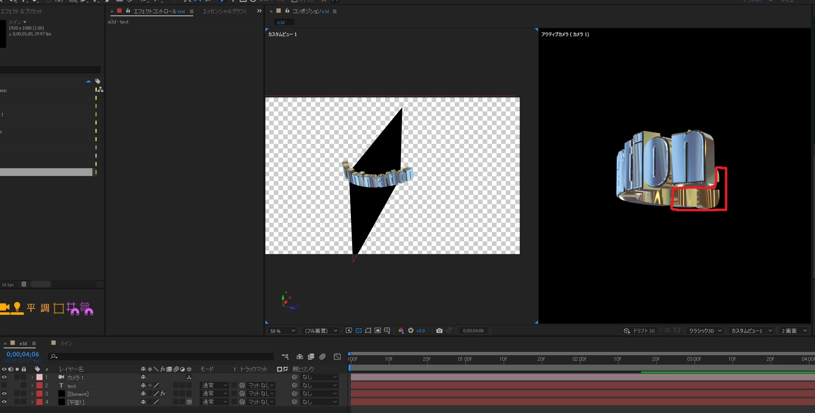 ・レイヤーの上下関係で平面を上にする:3Dテキスト自体が全く映らなくなる
