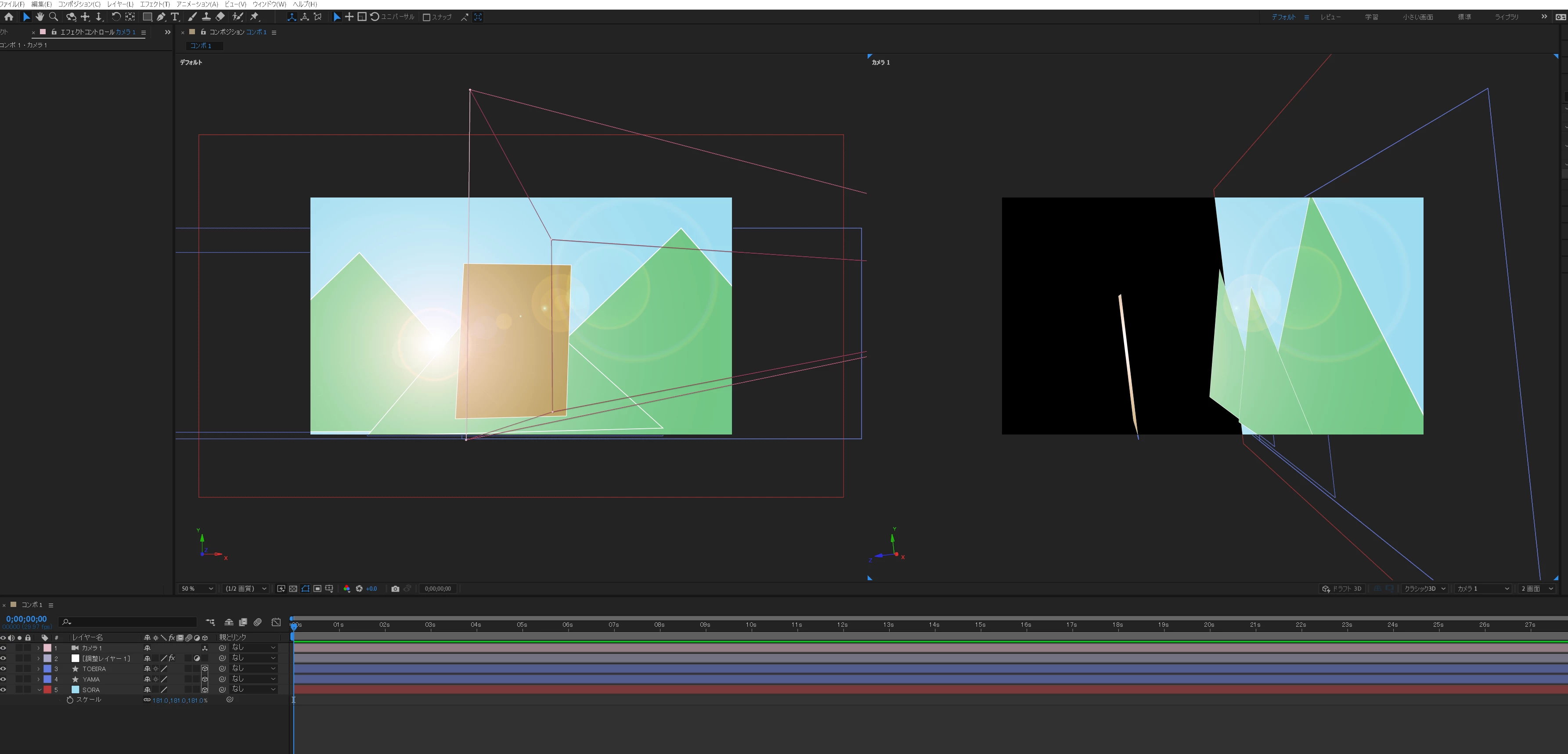Ppug012ParticipantForum|Forum|3 years agoMarch 4, 2023Question3D空間で光を使った表現はどのようにやりますか?Forum|Forum|3 years agoMarch 4, 20232 replies225 views下のイラストのように、山の間からのぞく日差しを3d空間で表現したいのですが、光レイヤーのzの位置を山の方に近づけるとドアにフレアが隠れてしまい、逆にドアz位置を近づけると、動かした時に山との位置が大幅にズレてしまい、不自然になります。そこで、山の間からのぞいているように見せかけながらも、ドアの前に光を持ってくる方法はありますでしょうか? 一応、それぞれのレイヤーのz位置も書いておきます。空&山(背景) 1000ドア 0 光レイヤーは現在-600で設定しております。(イラスト汚くてごめんなさい。) FAQ