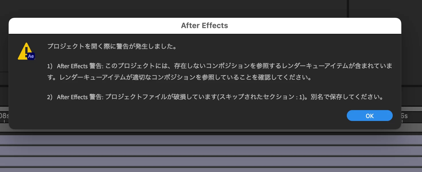 Ddefaultep6bt28ob8dgParticipantForum|Forum|10 months agoJune 3, 2025QuestionAeを起動させると「不当なトラックメモリID(22,33)」というエラーが出ますForum|Forum|10 months agoJune 3, 20252 replies200 viewsAeを起動させると「不当なトラックメモリID(22,33)」というエラーが出ます.「OK」を選択すると「プロジェクトを開く際に警告が発生しました」というダイアログが出てきます.さらに「OK」を選択しAeファイル内を確認すると,一部の読み込みファイルが消えてしまうという現象が度々生じています.何か原因が分かる方いらっしゃいましたら,お教え下さい. [環境]OS:Mac Ventura13.6.4 チップ:AppleM1 メモリ:16GBAeバージョン:24.4.1最大ディスクキャッシュは92GBに設定 エラーまたは問題