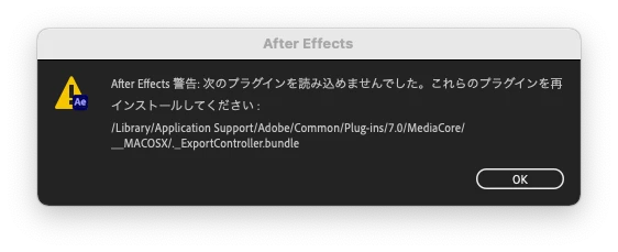 PPotchsInspiringForum|Forum|5 years agoApril 1, 2021QuestionAeを起動中に毎回おなじアラートが出ますForum|Forum|5 years agoApril 1, 20211 reply876 viewsAeを起動しようとするとスタートアップ画面の途中で添付のアラートが毎回出現しています。このせいで起動できないなどの不具合はないものの、気になっています。アラートに表示された「パス」をたどってみても確かに見当たらないファイルなのですが、ファイルパスにアンダーバーが記述されているのも謎のままです。[ExportController.bundle]というプラグインにも覚えはありません。このアラートが出現しないようにするにはどうしたらいいのか、解決策をご存じの方が居たら教えてください。エラーまたは問題