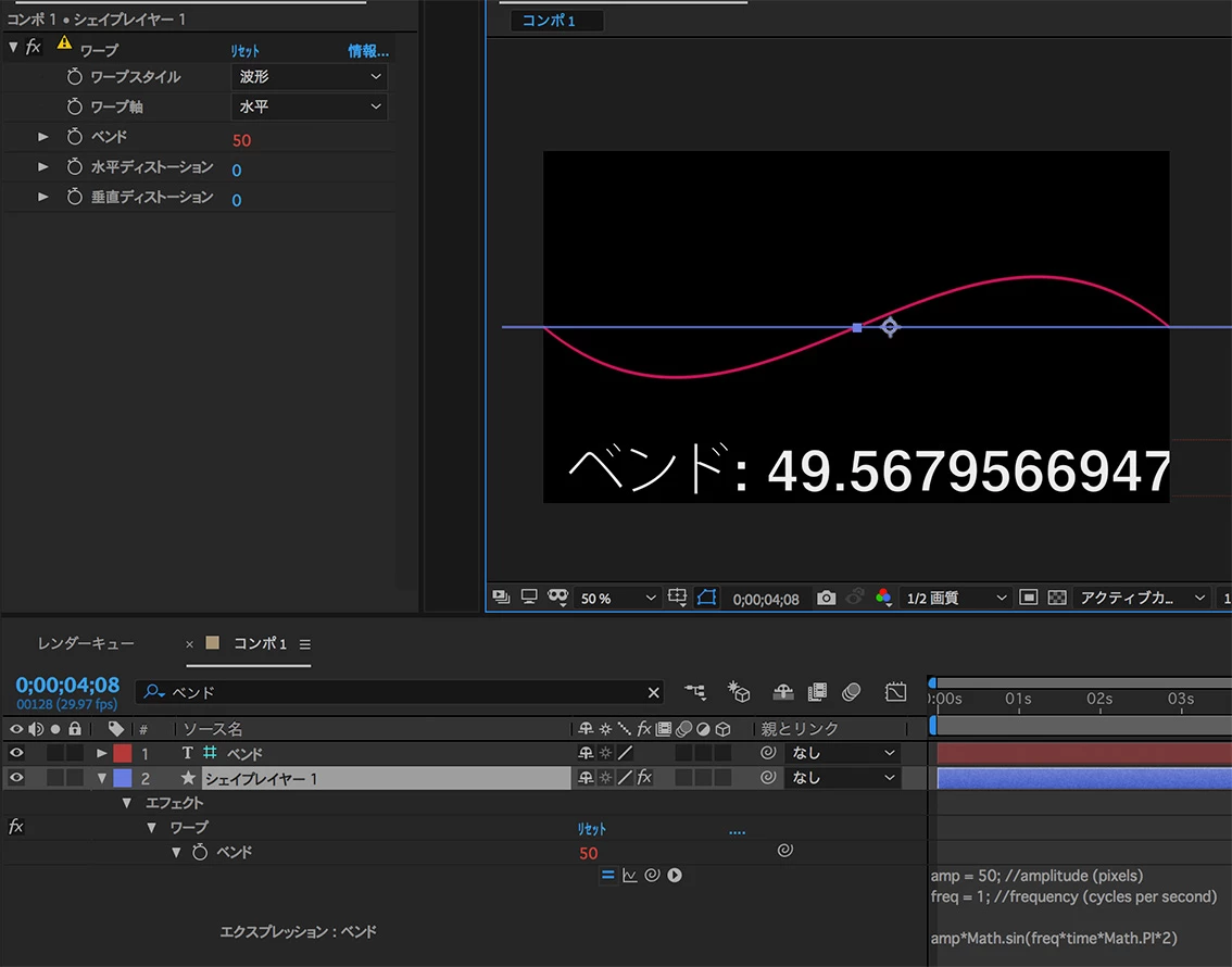 ・パスのレイヤーに、下記サイト(Flashを有効にするとサンプル画像が表示される)のエクスプレッションをコピーして、エフェクト「ワープ」の「ベンド」に貼り付けると上下に動きます。