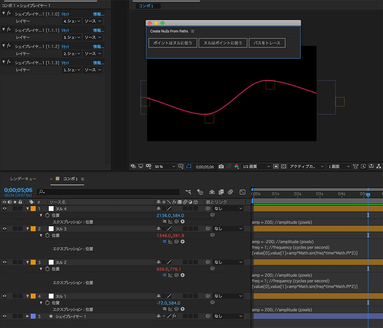 ヌルの「位置」に先程のエクスプレッションを応用した、下記の記述を貼り付ける。