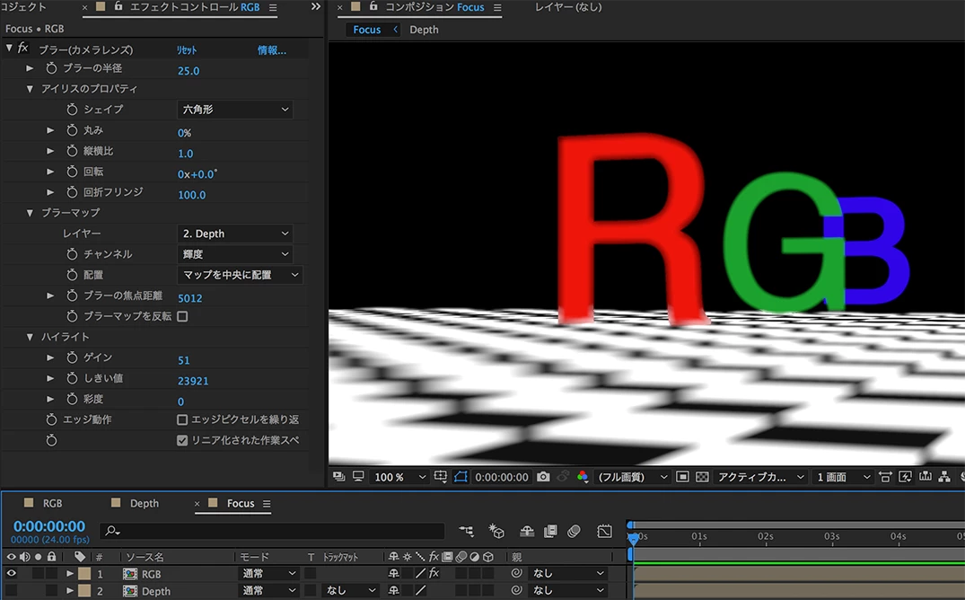 チュートリアルでは、ボカす時にAfter Effectsのプラグイン「Frischluft Lens Care 」を使っていますが、標準のエフェクト「ブラー(カメラレンズ)」でも可能です。