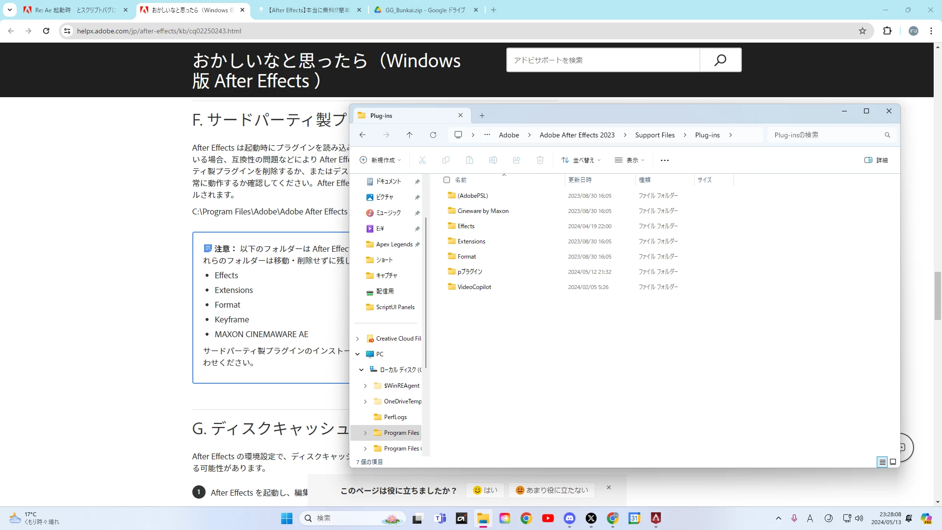 再インストールする前に、After Effectsフォルダー(Pluginなど)が残っているので別の場所に移動させてからインストールを行なって下さい。