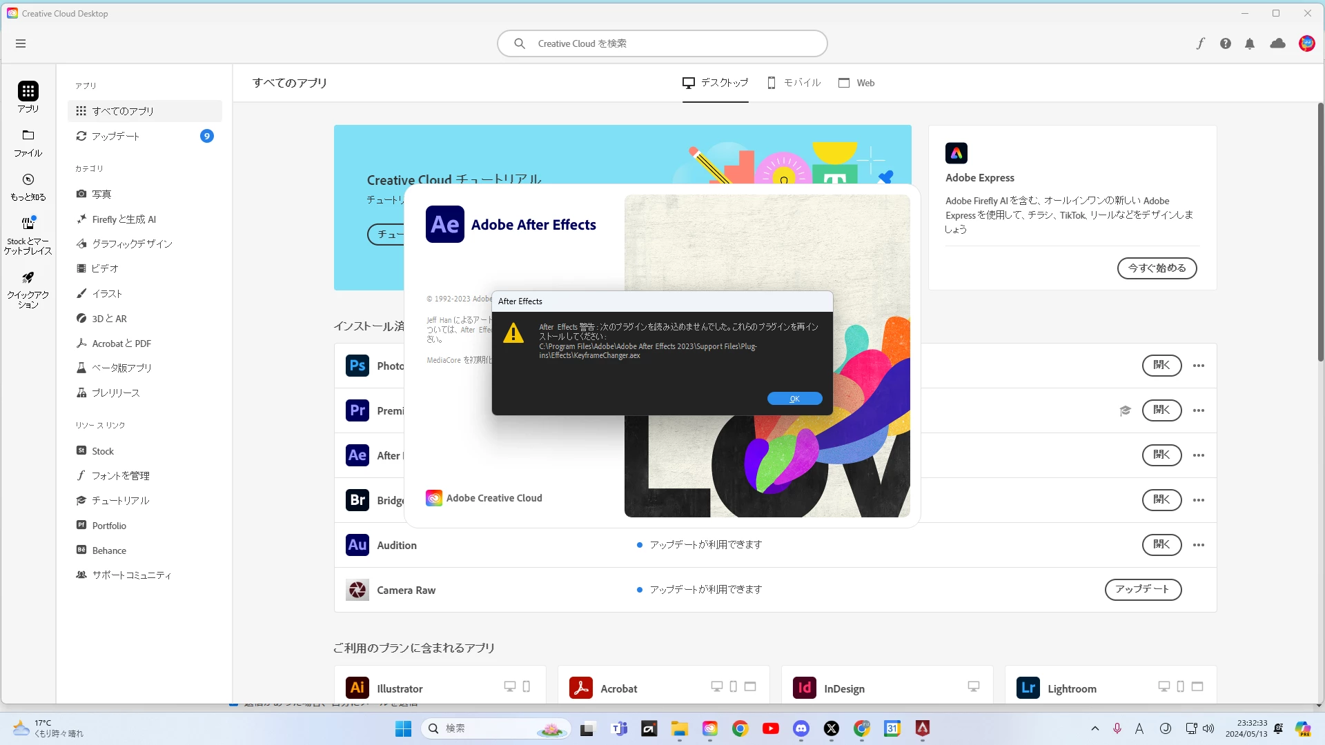 Keyframeフォルダーには標準プラグインが収録されているため、無くなっている場合は、CCデスクトップアプリを開いてAfter Effects をアンインストールしてから再インストールを実行して下さい。