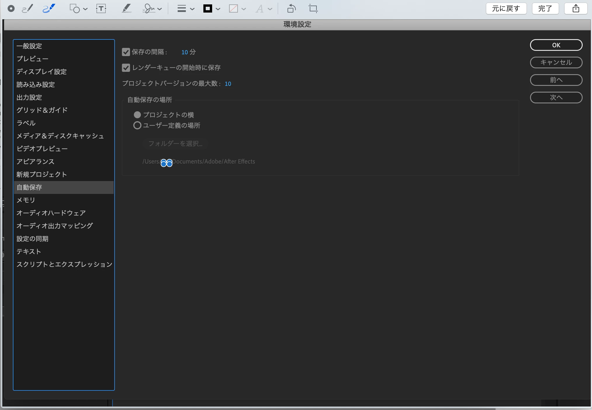自動保存の環境設定を開いても自動保存をonにするというボタンがなく、10分おきに自動保存という設定だけになっています。