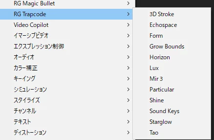 インストールしていた、RG Trapcodeの項目が全て表示されるようになりました。